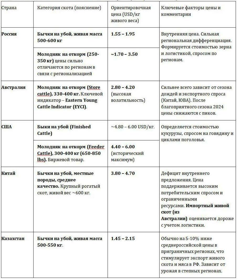 •Среднемировой/волатильный эталон: Австралия (~2.8-4.2 USD/кг). Цена отражает глобальный спрос на пастбищную говядину.